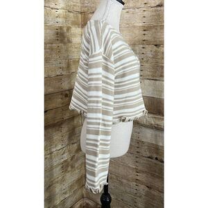 CROPPED WITH ROUND NECKLINE. SCALLOPED HEM LINES. KNIT PATTERN. STRIPED WITH WIDE SLEEVES. NO FLAWS. SEE PICS FOR MATERIAL TAG. OFFERS WELCOME