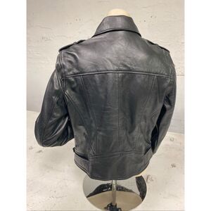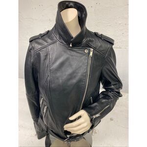 Beautiful 100% black leather and satin like polyester lining. Full zip, flip up collar, belt