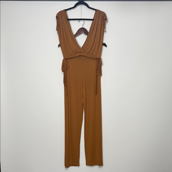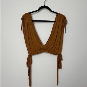 Crop top has tie shoulder details and side waist ties. V-neck and open back. Drapey and bohemian.