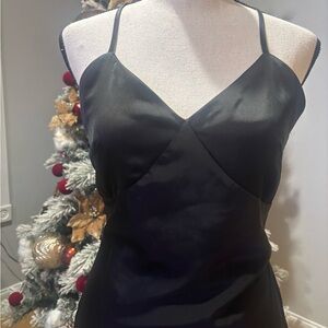 Chic black dress with a smooth finish. Features a flattering silhouette and thin straps. Ideal for stylish outings.used