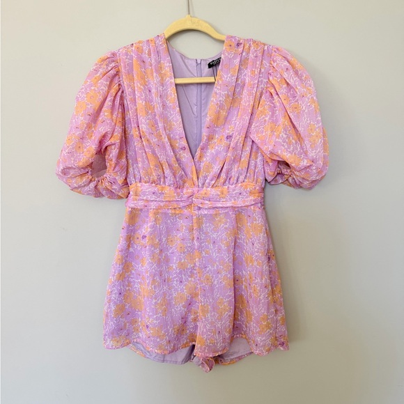 NASTY GAL Floral Puff Sleeve Chiffon V-Neck Romper—SZ. 4 zip back closure