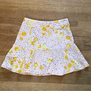 This petite skirt features a high waisted, mini silhouette, bias cut hem, elasticized waist, and floral and spotty print throughout. Excellent like new condition