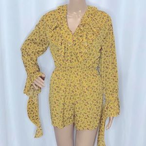 Flowy chiffon fabric. Floral print in yellow mustard with pink, purple tiny flowers , v-neck, poet sleeves with tie closure , tiered ruffle detailing at neckline.