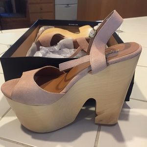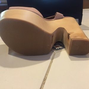 Brand new never worn! So adorable but ended up being to big. Height: 7.5"/19 cm. Heel Height: 5.5"/14cm. Platform height: 2.75"/ 7 cm. Beautiful light pink top and wood platform