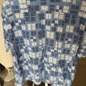 This Nat Nast Luxury Originals men's shirt is a stylish short sleeve button-up shirt made from a silk blend in a size XL. The shirt features a collared neckline with a spread collar, a blue geometric pattern, and embroidered accents. It is designed for various occasions including travel, parties, casual settings, and business wear. The breathable and lightweight fabric makes it suitable for all seasons, especially for summer, fall, and spring. With its beach and Hawaiian theme, this shirt is a classic addition to any man's wardrobe.