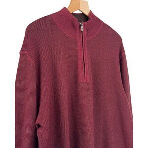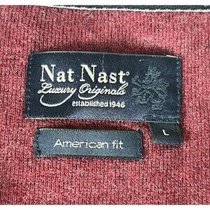 Nat Nast men's burgundy (Zinfandel Combo) ribbed 1/4 zip pullover sweater complete with elbow patches. Sweater is made of a cotton, nylon, cashmere blend and is a man's size large American Fit.
