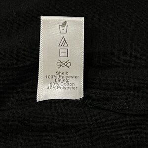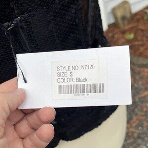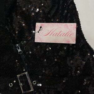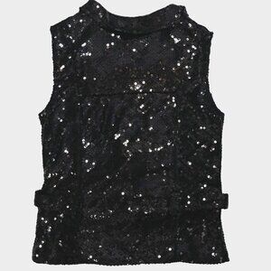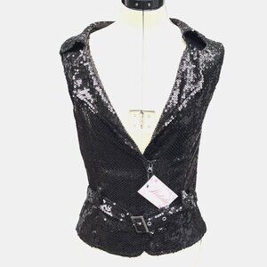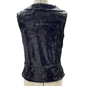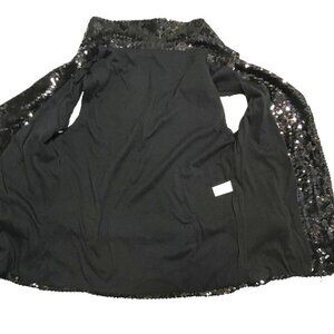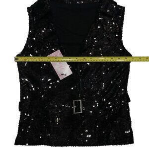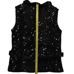 Black sequined vest with lapel and sequined belt. Zip front. Deep V-neck. Lined. 2 available: Small, Medium.