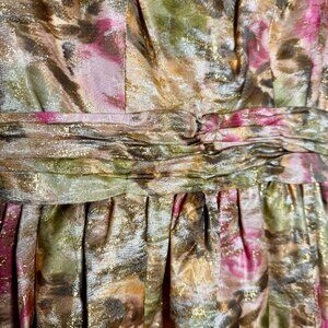 Vintage or vintage-style fit and flare dress. Brocade watercolor floral pattern of gold with hints of pinks, greens, and yellows. Gold embroidery thread gives it a sheen. No size listed but it's a tight fit, would suit an XS or an XXS. Good condition.