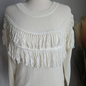Pullover Style. Wide Crew Neckline, V-Back. Long Sleeves. Fringed Front & Back.