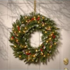 The Frosted Berry wreath features branch tips and pine cones that are touched with frosting to create the look of fresh fallen snow while groups of red berries add color and warmth. It is pre-strung with 50 clear lights that remain lit even if a bulb burns out. Display this wreath on doors, walls and windows in indoor or outdoor locations.