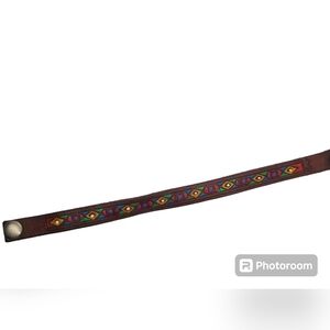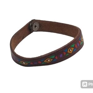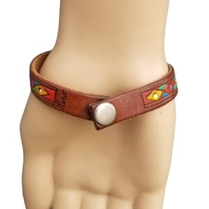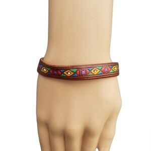 Unique handmade bracelet made with geuine leather and detailed with colorful native American designs. Bracelet is Native American made and signed by the the artist Parj or Purj. Bracelet measures 8 inches in total length and 1/2 inch wide with a snap style closure. Great condition.
