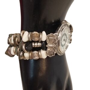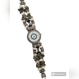 Unique watch with a native american style design. Watch has a large white face with turquoise detail and black dial numbers. Watch band consists of two rows of green/ blue gemstone and abalone shell beads. Watch measures 7-3/4 inches long and 1-1/2 inch wide. Watch is new without tags, may