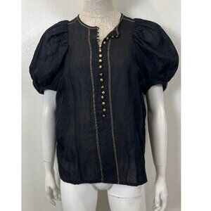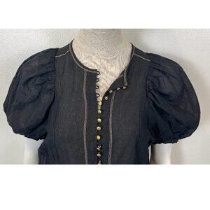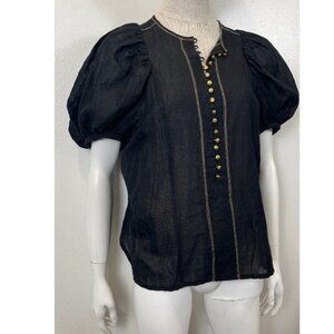 $285 NATIVE VILLAGE BLACK BOHO BLOUSE FITS A SMALL/MEDIUM WELL. FEATURES A COTTON AND LINEN BLEND BODY WITH GOLD BUTTON ACCENTS AND TONAL STITCHING. PERFECT CONDITION