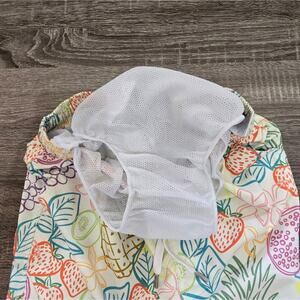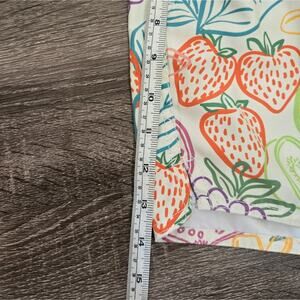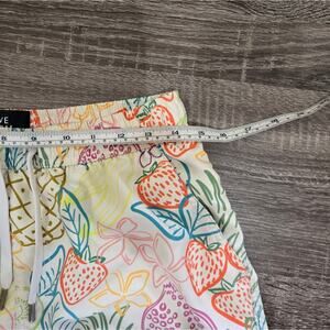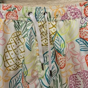 Tropical print shorts with vibrant fruit and leaf designs. Elastic waistband for comfort. Ideal for sunny days.