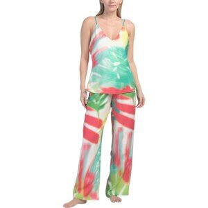 2 piece set includes sleeveless v-neck camisole and matching drawstring waist pants, adjustable shoulder straps, fabric provides stretch, printed