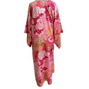NATORI Long Kimono Robe Sz L Geisha Floral Print Pink Red Satin *NO BELT*