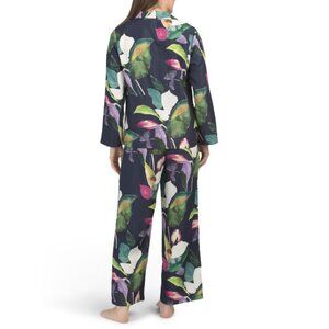 printed pattern, lightweight and breathable, 2 piece set includes 1 pajama top and 1 pair of pajama pants, pajama top: long sleeve, notch collar, side vents, pajama pants: drawstring waistband, elastic back waistband