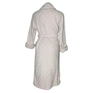 Soft and luxurious bathrobe. Features a shawl collar and tie belt. Perfect for bundling up after a hot shower. Beautiful embossed, soft fabric as shown in close-up. A light ballet pink. There’s an inside tie and a belt on the outside so it can be quite secure. Gently worn with no apparent flaws.