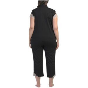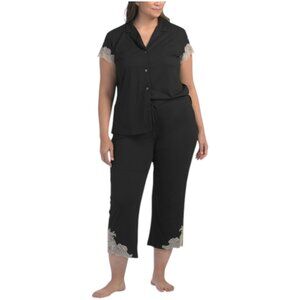 BRAND NEW Color: Black 2 piece set includes short sleeve notch collar button down top and matching drawstring waist pants, lace trim, soft and lightweight, fabric provides stretch top: button front closure, pants: pull on tencel modal/polyester/nylon/elastane imported machine wash