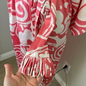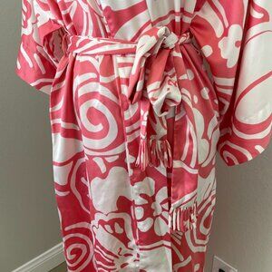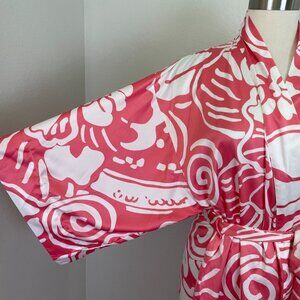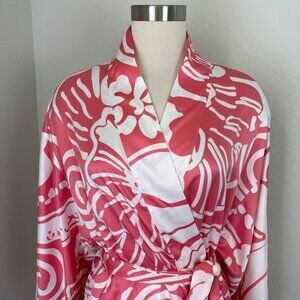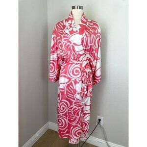 NATORI Womens XS Pink White 3/4 Sleeve Kimono Sleeve Satin Robe Midi Lounge