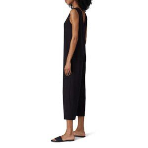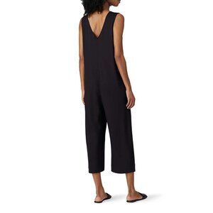Black crepe. Jumpsuit. Sleeveless. V-neckline. Fully lined.