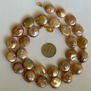 The coin pearls are large, approximately 14mm in diameter.