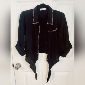 Stylish black button-down shirt with red stitching. Features a front pocket and tie-front design. Perfect for casual outings.