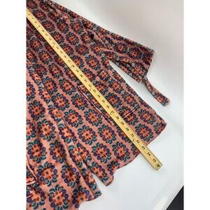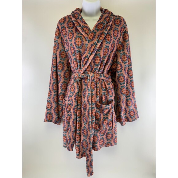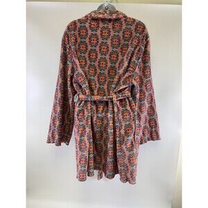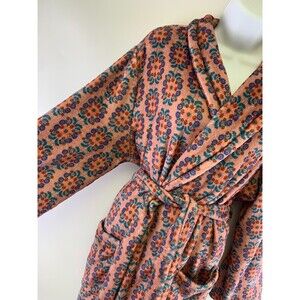 Cozy robe with vibrant floral design. Features a tie waist and front pocket. Perfect for lounging.