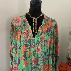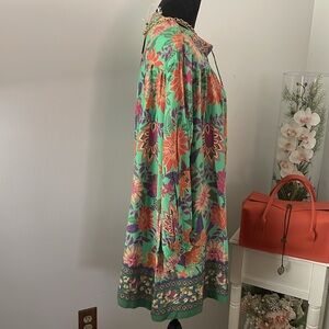This relaxed tunic from NATURAL LIFE features a vibrant mix of green and orange. Purple, pink and a touch of black hues, enhanced by a tassel ties design. The mandarin collar and long sleeves with elastic wrist add a touch of elegance, making it a perfect choice for a comfortable yet stylish look. Size is a generous M and measures 25’ from underarm to underarm and 33’ from shoulder to end of dress. Rayon mix material. New with tags from Natural Life of Florida.