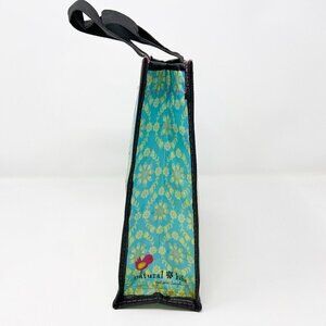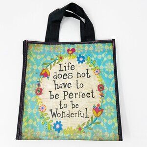 Medium turquoise and green flower print gift bag with a colorful flower border surrounding "Life Does Not Have To Be Perfect To Be Wonderful" in a hand-drawn style font front and back. Double handles made of nylon webbing make it easy to carry. They’re perfect for filling with tons of treasures you know your recipient will love… like mugs or jewelry!