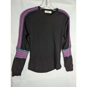 This Natural Life blouse is a cozy and stylish choice for the colder seasons. The top features a geometric floral pattern in black and multicolor on a waffle knit fabric, giving it a bohemian and peasant-inspired look. With long sleeves and a crew neck, it offers a classic fitted silhouette in a size small. Ideal for various occasions like travel, parties, work, or casual outings, this thermal top is machine washable for easy care. Perfect for adding a touch of artful and colorful flair to your winter, fall, or spring wardrobe.