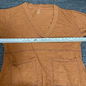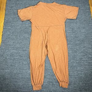 Casual orange jumpsuit with short sleeves. Features two front pockets. Comfortable and stylish.