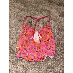 Vibrant pink crop top with floral design. Features orange and green flowers. Perfect for casual wear.