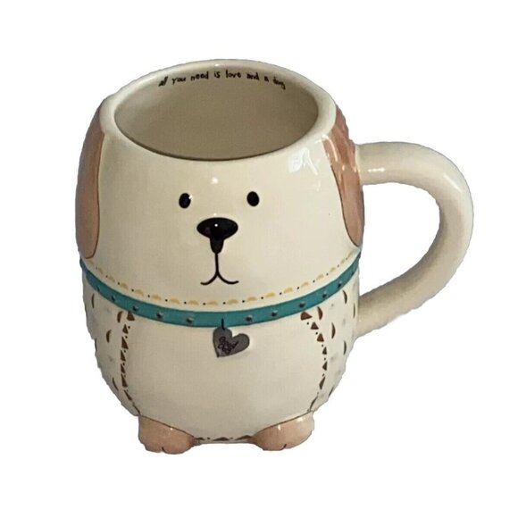This whimsical Natural Life mug features a charming painted design of a dog with the words "all you need is love and a dog" written in a playful font. The mug is made of ceramic and porcelain, and has a diameter of 3.25 inches with a height of 4.5 inches. It is perfect for all occasions and comes in a large size with a handle for easy grip.