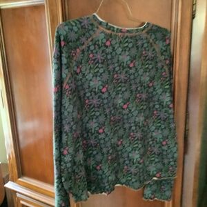 NATURAL LIFE long sleeve tee size XL. Floral print, purple blue & green on black backround. Ruffled at bottom of sleeves and hem with contrasting stitching. 100% cotton, machine washed or cold tumble dry low. More cropped, measures 22 inches from top of shoulder to hem.
