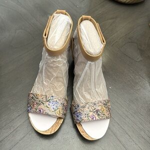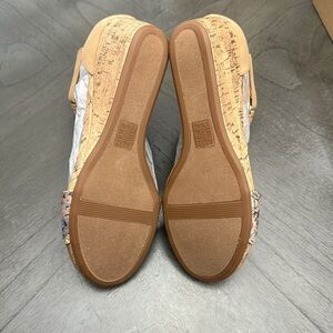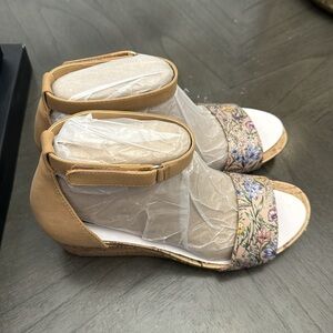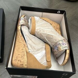 Non-stop comfort. This easy-going sandal makes a stylish statement with its contemporary cork bottom and sleek wedge silhouette. Wear what moves you. Comfy chic wedge sandal with a light cork bottom. Manmade/fabric or manmade upper with a round toe. Adjustable hook-and-loop closure. Contour+ technology for a premium fit and all-day comfort experience. Non-slip outsole. 2.75" cork heel. Designed using some environmentally preferred materials. WHY YOU'LL LOVE IT: Ingenious elegant utility. All-day heels that scale the height of chic with endless versatility and comfort that is downright clever.