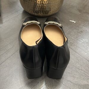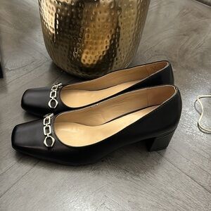 Style now, comfort always. Slip into this polished chainlink dress pump with a chic snip toe and walkable block heel. Get there beautifully. Classic, all-day dress pump with slip-on fit. Leather upper with a closed snip toe. Metallic chainlink ornamentation. Contour+ Comfort technology for a premium fit and all-day comfort experience. Non-slip outsole. 2.25" block heel. Consciously packaged: 100% of our shoe boxes are made of 80% recycled paper + soy-based ink. Designed using sustainable materials. WHY YOU'LL LOVE IT: Ingenious elegant utility. All-day heels that scale the height of chic with endless versatility and comfort that is downright clever.