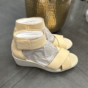 From day to night. This all-day wedge sandal rises to the occasion with its comfortable, on-trend white bottom and chic crisscross straps. Wear what moves you. Day-to-night comfy wedge sandal with white bottom. Metallic leather, leather, nubuck or suede upper with an open toe. Adjustable ankle strap closure. Contour+ technology for a premium fit and all-day comfort experience. Non-slip outsole. 2 1/4" wedge heel. Consciously packaged: 100% of our shoe boxes are made of 80% recycled paper + soy-based ink. Designed using sustainable materials. WHY YOU’LL LOVE IT: Ingenious elegant utility. All-day heels that scale the height of chic with endless versatility and comfort that is downright clever.