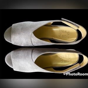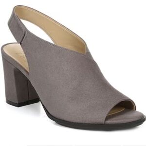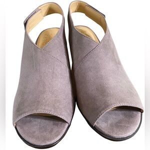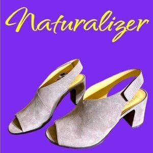 Naturalizer “Preston” taupe faux suede open-toe sandal with velcro strap for easy on/off. 3” heel. Super comfy! EUC like new!