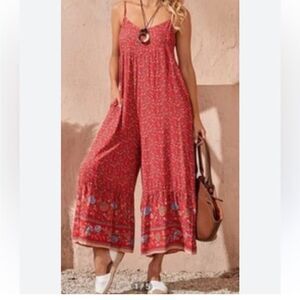 Experience effortless style with the NATURAL LIFE jumpsuit in red and blue floral lightweight flowy fabric. This wide-leg palazzo design with adjustable spaghetti straps offers a relaxed fit, perfect for both comfort and movement. This bohemian-inspired piece is crafted from lightweight fabric, perfect for casual outings or resort wear. This has been worn one time and I also have the red one for sale. Big discount If both are purchased!