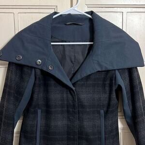 NAU size small black and charcoal gray jacket. 80% wool and 20% nylon. Great condition. Snaps up the front. Measures 19” from armpit to armpit and 23 1/2” long.