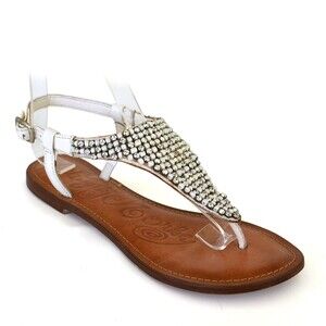 Step into effortless style with Naughty Monkey's leather slingback sandals, size 6.5. These white sandals feature a beaded toe post design, adding a touch of whimsy to your everyday look. The adjustable strap ensures a comfortable fit while the buckle closure provides secure steps. Crafted for women who appreciate both fashion and comfort, these flat sandals boast a durable leather upper and a beaded accent that lends a playful charm. Perfect for sunny days and balmy evenings, these sandals are a versatile addition to your warm-weather wardrobe.
