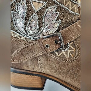 Look at these booties! They have pretty sequin, beaded and embroidery details. These are by Naughty Monkey and come in size 6.5. A perfect boho summer boot. I don't see any wear on these and the color wld be described as a grey/tan. Straps come across the front and buckle on outside ankle. The heel height is 1.5", the shaft of boot is 7" (not including heel) Picture these with a little romper or maxi skirt.