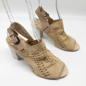 Weaved suede peep toe sandal.