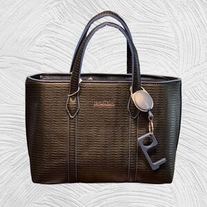 The Nautica Leeway is a roomy vegan leather satchel-style tote bag with silver-tone hardware, pockets inside and out with on-trend texture throughout the exterior and a logo placard on the front face. It also features rolled top handles for easy carrying and an adjustable/removable crossbody shoulder strap.