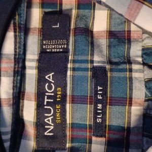NAUTICA MENS SHORT SLEEVE SHIRT, SIZE LARGE, SLIM FIT. ALL BUTTONS ATTACHED. MEASUREMENTS ARE BELOW APPROX. great condition.