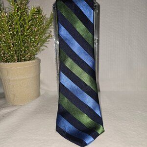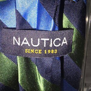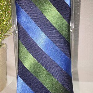 NAUTICA MENS TIE 100% SILK DIAGONAL STRIPES IN GREEN CERALON BLUE AND NAVY EUC
