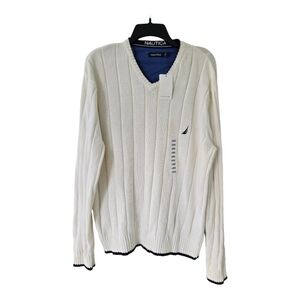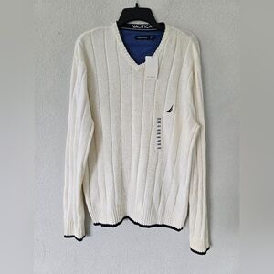 This Nautica sweater is a versatile piece for men, perfect for any occasion from casual to business wear. The chunky knit design with a V-neckline and long sleeves is both stylish and comfortable, making it suitable for all seasons. The beige color and outdoor, classic, and retro theme add a touch of eclecticism to any outfit.