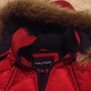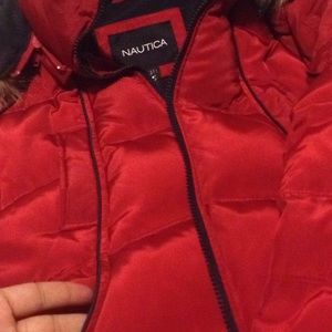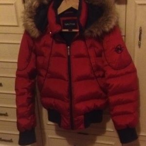 Deep red Navy blue color, tow side pockets on chest, tow side pockets above waist line!, Faux fur new detachable zippered WIDE hoody. Only worn ONCE!! 😔 In perfect condition!😍, no tags.