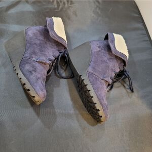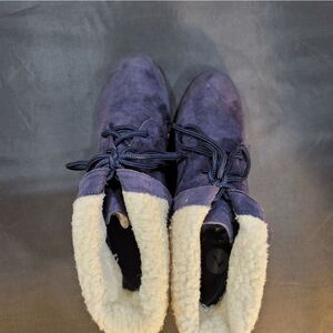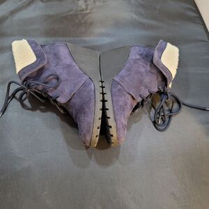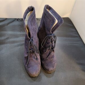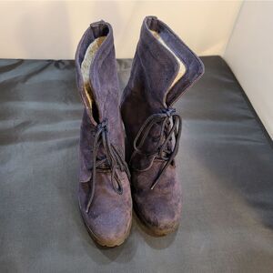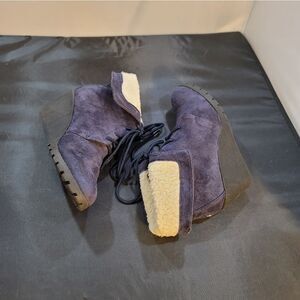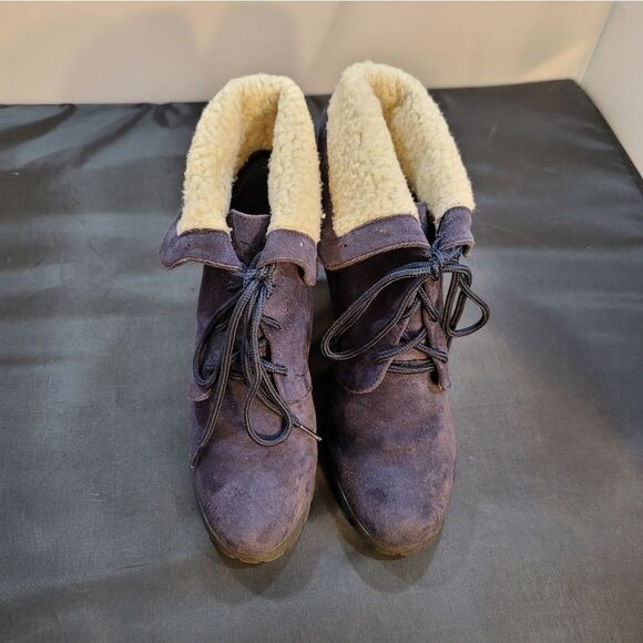 NAUTICA SUEDE WEDGE FAUX FUR ANKLE WOMENS LACE UP BOOTIE COLOR NAVY BLUE SIZE 7 SLIP RESISTANCE RUBBER SOLE SHERPA LINING AT THE ANKLE WEAR LACE UP OR FOLD DOWN ALL MAN-MADE MATERIALS LINING OUTSOLE MAN-MADE MATERIALS HEEL HEIGHT MEASUREMENTS APPROX 3"INCHES THIS ITEMS IS PRE-OWNED EXCELLENT CONDITION WITH ONLY LIGHT SIGNS OF WEAR IF ANY CHECK THE PICTURES